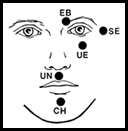 EYEBROW (EB), SIDE OF EYE (SE), UNDER EYE (UE), UNDER NOSE (UN), CHIN (CH)